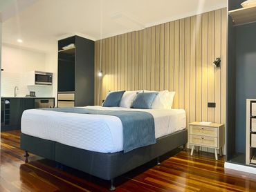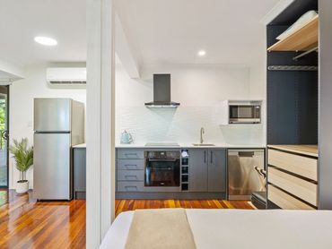 Including, Wall Oven, induction cooktop, microwave and full-sized fridge for easy self-catering.